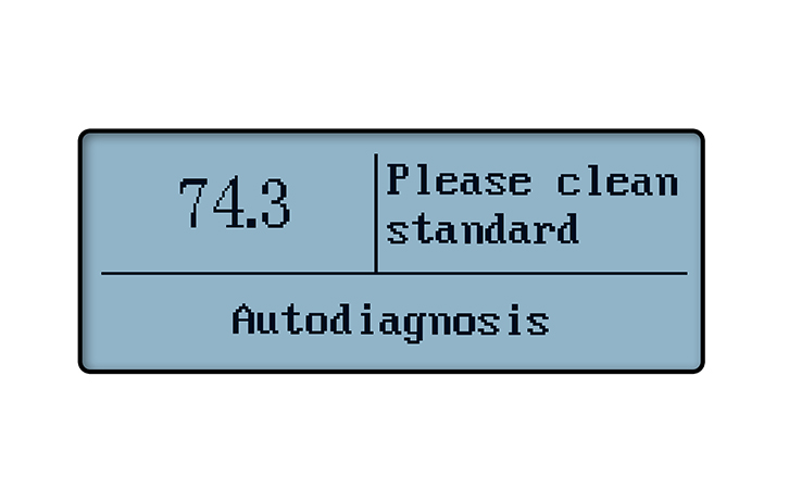 1、开机仪器会自校准,当检测标准板不在合格范围,会显示以下英文,提示清洁标准板,要用仪器标配的镜头布来清洁,如用其他清洁布会划伤标准板影响测量结果。然后把主机扣入底座。