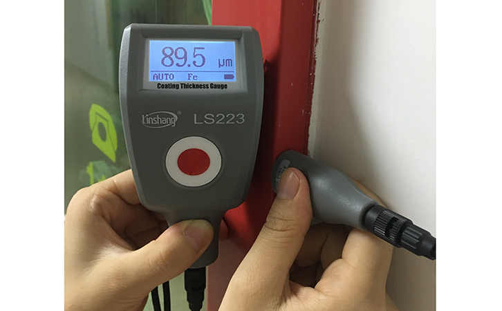 分体式镀层测厚仪LS223,在自动识别的模式下,可以自动识别基底材料,并且自动转换测量的模式,保证了测量数据准确性。下面就实测了消防栓边框金属镀层的厚度是89.5μm。仪器只有一个按键,操作非常简单。