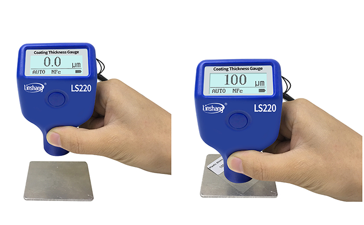 油漆涂层测厚仪LS220,在开始测量时要准备好待测件,按键开机后,屏幕上就会显示上次关机前测量数值。如果想要调零,先将LS220的测头垂直按压在待测件的表面,长按仪器上按键3秒,根据提示压紧以及提起探头,听到蜂鸣器提示声,显示0.0表示调零完毕,可以开始测试了。